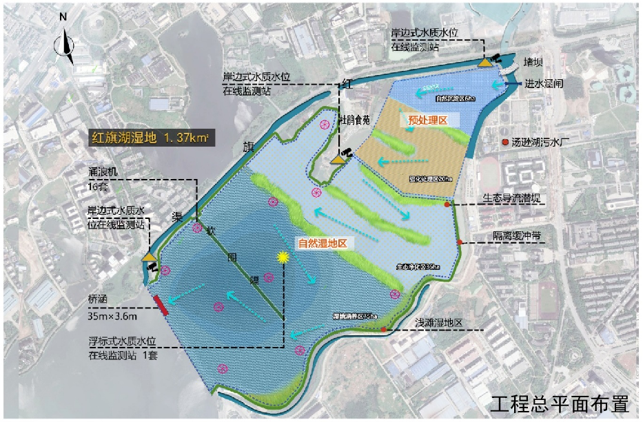 汤逊湖沿湖排口截污改造工程首次大规模应用智能分流井和截流井技术,可根据井内水位或雨量控制堰门的开闭,实现精确截流;避免湖水向污水管网倒灌;可联网远程控制,实现自动化精准运行。该工程充分利用红旗湖作为汤逊湖独立子湖的地理优势,采用EHBR工艺、生态系统稳定塘,有效发挥红旗湖作为湖湾生态缓冲区净化汤逊湖污水厂尾水的作用,通过“治湖先治湾”综合技术应用,实现经济和生态效益双赢。